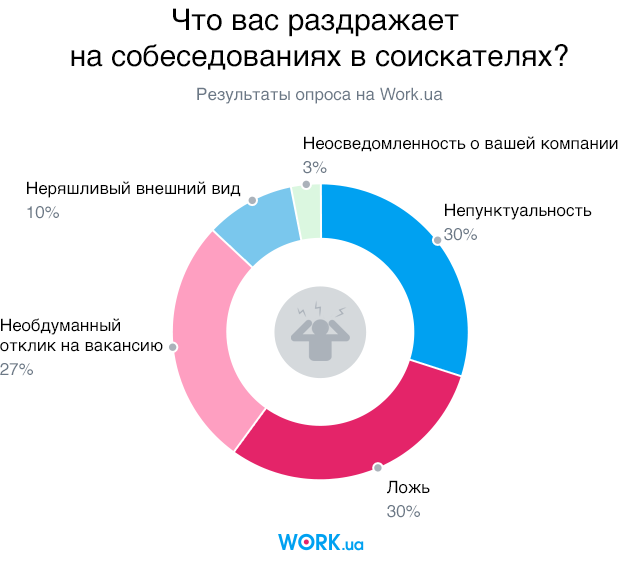 Згідно з опитуванням, проведеним Work.ua, на співбесіді більшість роботодавців дратують запізнення і брехня, а претендентів - непрофесіоналізм рекрутерів.